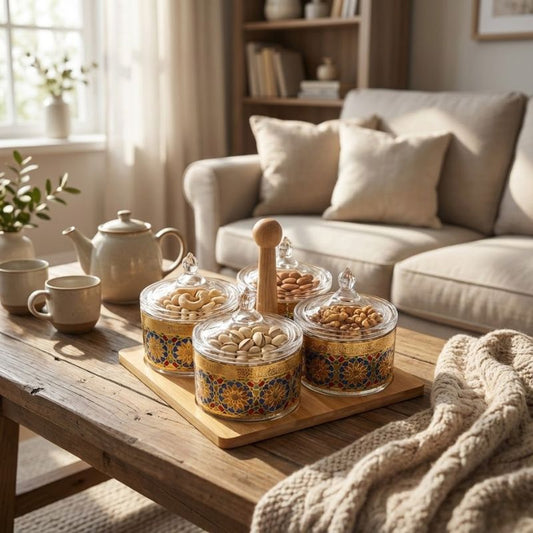 Ensemble de pots décoratifs avec couvercles en bambou et plateau doré